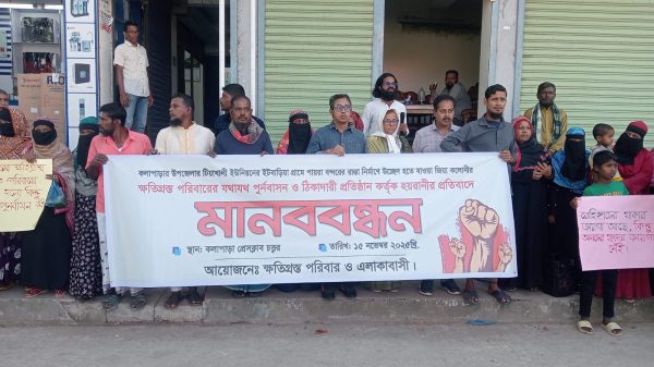 কলাপাড়ায় ক্ষতিগ্রস্থ ১৩৬ পরিবারের মানববন্ধন