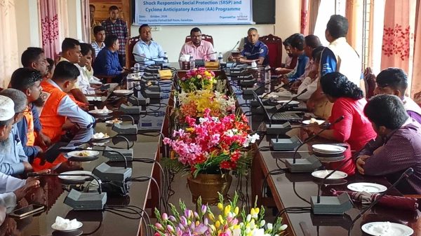 বৃহস্পতিবার গলাচিপা উপজেলা পরিষদ হল রুমে ঘূর্ণিঝড় পূর্ব প্রস্তুতি হিসেবে উপজেলা দুর্যোগ ব্যবস্থাপনা কমিটির অবহিতকরন সভা অনুষ্ঠিত হয়। সভায় সভাপতিত্ব করেন উপজেলা নির্বাহী কর্মকর্তা জনাব মোঃ মিজানুর রহমান। উন্নয়ন সংস্থা সুশীলন এর আয়োজনে দাতা সংস্থা বিশ্ব খাদ্য কর্মসূচী(WFP) এর অর্থায়নে গলাচিপা উপজেলায় “বাংলাদেশের দক্ষিন পশ্চিমাঞ্চলে ঘূর্নিঝড় পূর্বাভাস ভিত্তিক শক প্রতিক্রিয়াশীল সামাজিক সুরক্ষা কর্মসূচীর আওতায় (Project on Shock responsive social protection Programme in South Western Bangladesh) গলাচিপা উপজেলার ৫টি ইউনিয়নে আগাম সাড়াদান কার্যক্রম বাস্তবায়ন করা হচ্ছে। উপকূলীয় দ্বীপাঞ্চল উপজেলার পানপর্টি, গলাচিপা সদর, রতনদি তালতলী, চর কাজল এবং চর বিশ্বাস ইউনিয়নের মানুষকে সচেতন করা, ঘূর্ণিঝড়ের আগাম প্রস্তুতি নিতে করনীয় এবং দুর্যোগকালীন সময়ে করনীয় বিষয়ে সুশীলন মাঠ পর্যায়ে যে সকল কাজ করে তার সার্বিক বিষয়ে আলোচনা করেন সুশীলন এর গলাচিপা উপজেলা সমন্বয়কারী সুব্রত কুমার গাইন, সহযোগী ফিল্ড ফ্যাসিলিটেটর মোঃ আরাফাত হোসেন এবং আফরোজা খাতুন পপি।