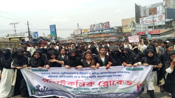 বুধবার (১৬ এপ্রিল) সকাল সাড়ে ১১টার দিকে তারা বরিশালের মহাসড়ক নতুল্লাবাদ এলাকার সড়ক অবরোধ করেন।অবরোধে দেশের বিভিন্ন পলিটেকনিক ইনস্টিটিউটের শিক্ষার্থীরা অংশ নিয়েছেন। বরিশাল পলিটেকনিক ইনস্টিটিউটগুলোর আরও শিক্ষার্থী কর্মসূচিতে অংশ নিতে ওই এলাকায় জড়ো হচ্ছেন।শিক্ষার্থীদের অবরোধের কারণে সড়কে যান চলাচল বন্ধ হয়ে গেছে। অবরোধ আর যানজটের কারণে সড়কে চলাচলকারী মানুষ পড়েছেন সীমাহীন দুর্ভোগে। অবরোধের কারণে সৃষ্ট যানজট ইতোমধ্যে দুইপাশের দীর্ঘ হচ্ছে চলে গেছে।বিষয়টি নিশ্চিত করে বরিশাল এয়ারপোর্ট থানা অফিসার ইনচার্জ বলেন, ছাত্রদের আন্দোলনের কারনে যান চলাচল বন্ধ করে দিয়েছে বরিশাল পলিটেকনিকের শিক্ষার্থীরা। আমাদের ট্রাফিক পুলিশ সদস্যরা কাজ করছেন।শিক্ষার্থীরা বলছেন, আমরা আগেও একাধিকবার একই দাবি উত্থাপন করেছি, কেউ কর্ণপাত করেনি। এখন আমরা রাস্তা অবরোধ করেছি।তাদের অবরোধের কারণে ঢাকা বরিশাল সড়কে যানজট সীমাহীন আকার ধারণ করেছে। ঊর্ধ্বতন কর্তৃপক্ষসহ সংশ্লিষ্ট কর্মকর্তাদের বিষয়টি অবগত করা হয়েছে বলে জানিয়েছেন পুলিশ কর্মকর্তারা।