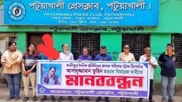 পটুয়াখালীতে সাংবাদিক তুহিন হত্যার প্রতিবাদে মানববন্ধন।