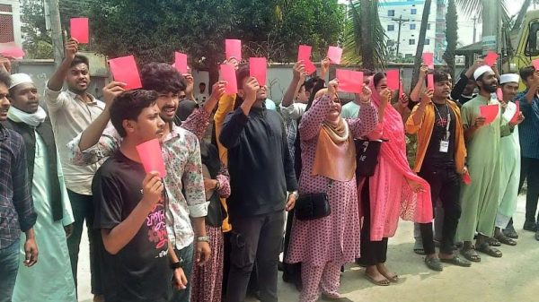 বাউফলে বৈষম্যবিরোধী শিক্ষার্থীদের লাল কার্ড প্রদর্শন মিছিল