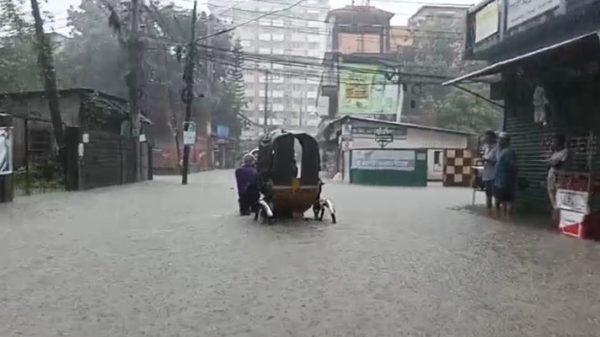 রাস্তাঘাট প্লাবিত হয়ে যানবাহন চলাচল ব্যাহত হয়েছে।