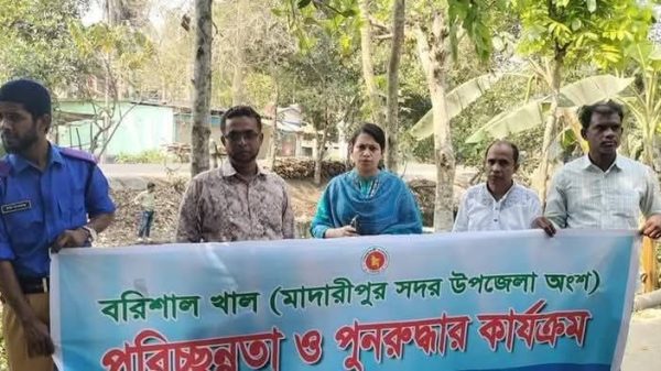 মাদারীপুর শহরের ইটেরপুল থেকে পাথুরিয়ারপাড় পর্যন্ত বিস্তৃত ‘বরিশাল খাল’। খালটি দখল-দূষনে অস্তিত্ব হারিয়ে যাওয়ায় পরিচ্ছন্নতা ও পুনরুদ্ধার কার্যক্রম শুরু করেছে সদর উপজেলা প্রশাসন। গতকাল মঙ্গলবার দুপুরে জেলা প্রশাসনের নির্দেশনায় মাদারীপুর সদর উপজেলার ঘটমাঝি ইউনিয়নের মন্টারপোল এলাকায় ‘বরিশাল খাল পরিচ্ছন্নতা ও পুনরুদ্ধার কার্যক্রমের উদ্বোধন করেন সদর উপজেলা নির্বাহী অফিসার ওয়াদিয়া শাবাব। এসময় ওয়াদিয়া শাবাব বলেন, সারাদেশে খাল দখলমুক্ত ও পরিষ্কার করার অংশ হিসেবে মাদারীপুর জেলা প্রশাসক স্যারের নির্দেশনায় ‘বরিশাল খাল পরিষ্কার ও পুনরুদ্ধার কার্যক্রম চলমান রয়েছে। ইতিমধ্যে আমরা খালের দু’পাড়ে অবৈধ স্থাপনা উচ্ছেদ করেছি। খালের ময়লা আবর্জনা পরিষ্কার করে পানি প্রবাহ নিশ্চিত করবো আমরা। সকলের সহযোগিতা কামনা করে তিনি বলেন, খালটিতে যেন কেউ কোন ময়লা আবর্জনা না ফেলে। তিনি আরো বলেন, খালটি পরিষ্কার হলে পানি প্রবাহের ফলে কৃষি কাজে সফলতা আসবে। এসময় উপস্থিত ছিলেন মাদারীপুর সদর উপজেলা সহকারী কমিশনার (ভুমি) ফাতেমা তুজ জোহরা সানিয়া প্রকল্প বাস্তবায়ন কর্মকর্তা মোহাম্মদ নজরুল ইসলাম, ঘটমাঝি ইউনিয়ন পরিষদের প্রশাসনিক কর্মকর্তা সাইফুল ইসলাম, উপ সহকারী ভ‚মি কর্মকর্তা আক্তার হোসেন সহ অন্যরা। উল্লেখ্য, খালটি দীর্ঘদিনে সংস্কার না হওয়ায়, দখল আর দূষণে বন্ধ হয়ে যায় খালের পানি প্রবাহ। ময়লা-আবর্জনায় খালটি প্রায় বন্ধের উপক্রম। দুর্গন্ধ সহ বেড়েছে মশা মাছির উপদ্রব এবং রোগে আক্রান্ত হচ্ছে স্থানীয়রা। সেচ কাজে ব্যাহত হয়েছে।