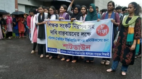 শিক্ষক সংকট নিরসনসহ ৮ দফা দাবি বাস্তবায়নের লক্ষে বরিশাল টেক্সটাইল ইঞ্জিনিয়ারিং কলেজে অনির্দিষ্টকালের জন্য শাটডাউন ঘোষণা করা হয়েছে। রবিবার দুপুরে কলেজ ক্যাম্পাসের প্রশাসনিক ভবনে তালা দিয়ে শাটডাউন ঘোষণা করে শিক্ষার্থীরা।