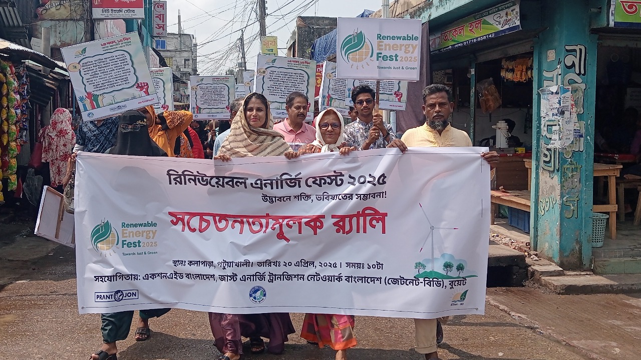 পটুয়াখালীর কলাপাড়ায় জলবায়ু সংকট মোকাবেলা, নবায়নযোগ্য জ্বালানির ব্যবহার বৃদ্ধি এবং ন্যায়সঙ্গত জ্বালানি রূপান্তরের গুরুত্ব সম্পর্কে গণসচেতনতা তৈরিতে এক র্যালী অনুষ্ঠিত হয়।রবিবার বেলা ১১ টার দিকে একশন এইড বাংলাদেশ, বুয়েট ও জাষ্ট এনার্জি ট্রানজিশন নেটওয়ার্ক বাংলাদেশের সহযোগিতায় রলীটি স্থানীয় প্রেসক্লাব চত্বর থেকে বের হয়ে পৌর শহরের বিভিন্ন সড়ক প্রদক্ষিন করে। পরে প্রেসক্লাব চত্বরে এক সংক্ষিপ্ত সমাবেশে পরিবেশ ও জনসুরক্ষা মঞ্চের সদস্য সচিব মনোয়ারা বেগম বলেন, "জ্বালানি খাতের টেকসই রূপান্তর শুধু সরকার বা প্রতিষ্ঠানের দায়িত্ব নয়; এতে সমাজের প্রতিটি স্তরের অংশগ্রহণ জরুরি বলে তিনি উল্লেখ করেন।এতে উন্নয়ন সংস্থা প্রান্তজন, কলাপাড়া পরিবেশ সুরক্ষা মঞ্চ এবং আমরা কলাপাড়া বাসী স্বেচ্ছাসেবী সংগঠনের নেতৃবৃন্দ উপস্থিত ছিলেন।