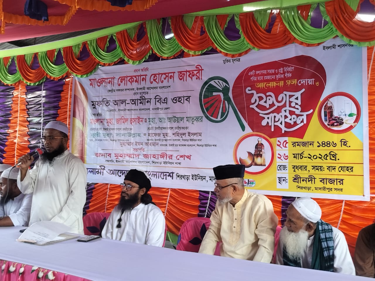 মাদারীপুর সদর উপজেলার শিরখাড়া ইউনিয়নের শ্রীনদি বাজারে, ইসলামি আন্দোলন বাংলাদেশ এর ইফতার ও দোয়া মাহফিল অনুষ্ঠিত।বুধবার (২৬ মার্চ) বাদ যোহর এ সভা অনুষ্ঠিত হয়।প্রথান অতিথি হিসেবে উপস্থিত ছিলেন, মাওলানা লোকমান হোসেন জাফরী, কেন্দ্রীয় দফতর সম্পাদক, ইসলামি আন্দোলন বাংলাদেশ। প্রথান আলোচক, মুফতি আল - আমীন বিএ ওহাব সেক্রেটারি ইসলামি আন্দোলন বাংলাদেশ মাদারীপুর জেলা।বিশেষ অতিথি ছিলেন, মাওলানা মুহা. সানাউল্লাহ, দ্বীন কায়েম সংগঠন, শিরখাড়া ইউনিয়ন। এ-সময় উপস্থিত ছিলেন, জনাব মোঃ জাহাঙ্গীর শেখ, সভাপতি ইসলামি আন্দোলন বাংলাদেশ, শিরখাড়া ইউনিয়ন শাখা, মোঃ আউয়াল মাতুব্বর সেক্রেটারী মাদারীপুর সদর থানা, হাফেজ মোঃ শহিদুল ইসলাম, শিরখাড়া ইউনিয়ন, মোঃ ইমন আহমেদ শিরখাড়া ইউনিয়ন শাখা, ইসলামি আন্দোলন বাংলাদেশ এর ইফতার মাহফিলে আরোও বিভিন্ন আলেম উলামায়ে কেরাম এবং স্থানীয় মুসল্লিরা উপস্থিত ছিলেন।