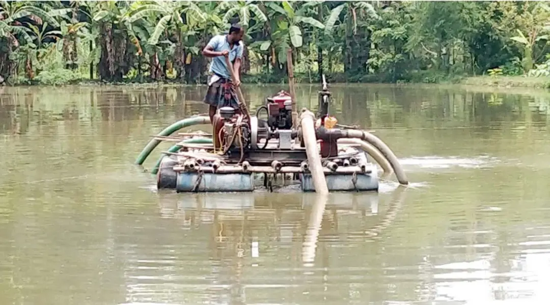 স্থানীয় সূত্র জানায়, বাকাল ইউনিয়নের উত্তর বড়মগড়া গ্রামের মৃত ধনঞ্জয় বাড়ৈর ছেলে জনমিন জন বাড়ৈ আওয়ামী লীগ সরকারের সময়ে ছাত্রলীগের নেতাদের প্রভাব দেখিয়ে একাধিক ড্রেজার মেশিন দিয়ে ফসলি জমি থেকে বালু তুলেছিলেন।