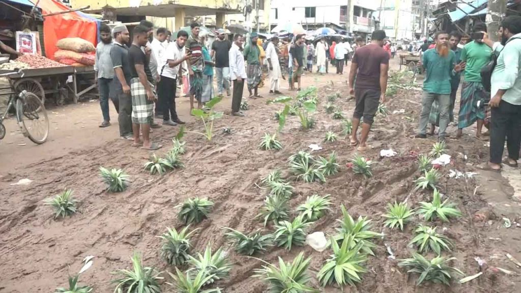 রোববার (১৩ জুলাই) সকালে পোর্টরোডে স্থানীয় ব্যবসায়ীদের উদ্যোগে মানববন্ধন করা হয়। পরে তারা রাস্তায় আনারস রোপন করে।