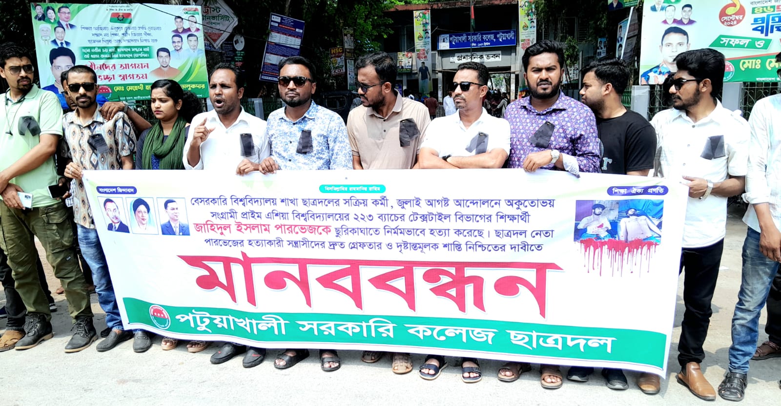 প্রাইম এশিয়া বিশ্ববিদ্যালয়ের ২২৩ তম ব্যাচের মেধাবী শিক্ষার্থী বিশ্ববিদ্যালয় শাখা ছাত্রদলের সক্রিয় কর্মী জাহিদুল ইসলাম পারভেজকে ছুরিকাঘাতকরে নির্মম হত্যাকান্ডের সাথে জড়িত সন্ত্রাসীদের গ্রেফতার ও দৃস্টান্তমূলক শাস্তির দাবীতে পটুয়াখালী সরকারি কলেজ শাখা ছাত্রদলের উদ্যোগে মানববন্ধন কর্মসূচী পালিত।